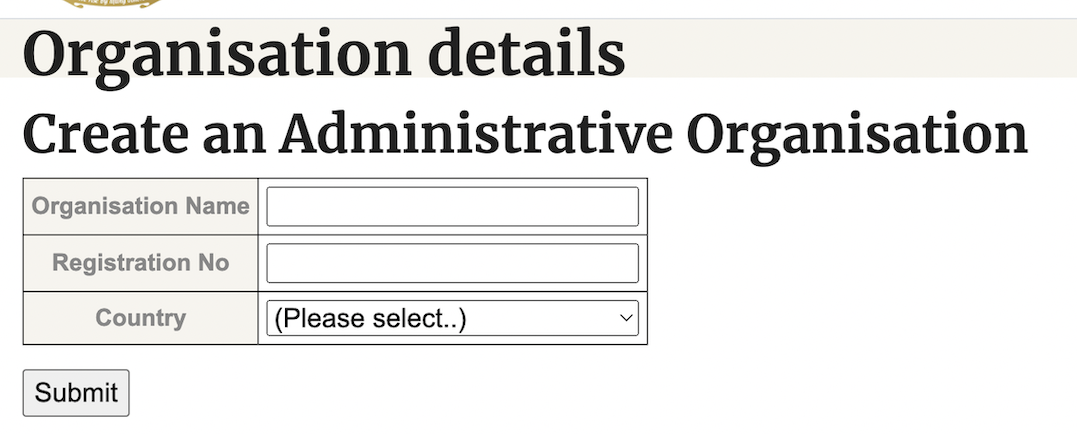 This will display a Create and Admininstrative Organisation form: