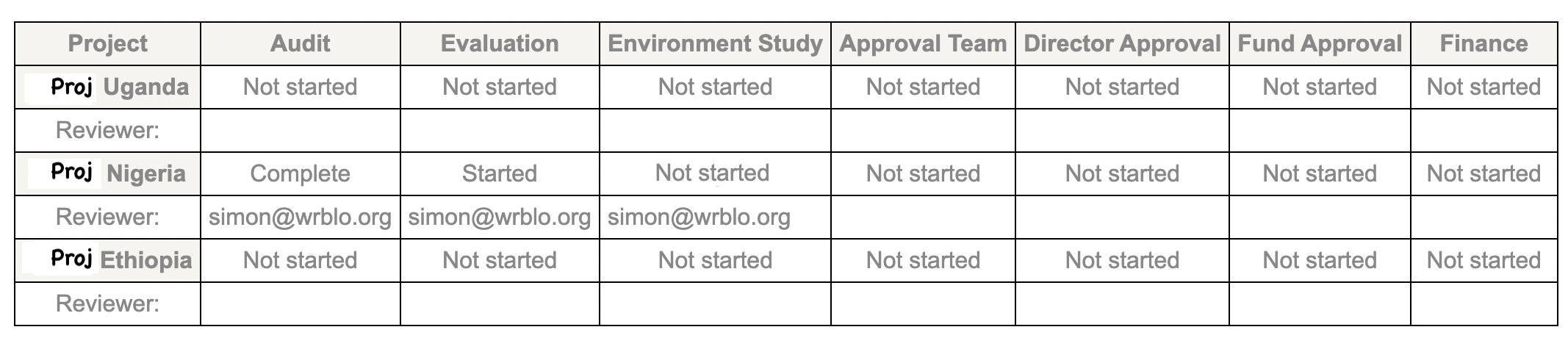 The Assessment table will show once you have created projects and the initial evaluation is complete. Assessments follow each other, starting with the Audit and ending with Finance. Each assessment will show as Not started, Started or Complete.
